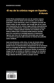 Carles Porta probablemente sea uno de nuestros mejores periodistas, pero sin duda se ha coronado, con sus libros, podcasts y series televisivas, como un magistral narrador de relatos reales. En este volumen, que recoge diez de los casos más impactantes de la crónica negra reciente, descubriremos su especialidad literaria: contarnos extraordinarias historias de crimen y trabajo policial mientras nos mantiene en vilo hasta la última línea. La fórmula puede parecer sencilla, pero él la convierte en inimitable gracias al tratamiento riguroso que hace de los grandes personajes que escoge y la manera en que los sabe envolver en tramas tan potentes como verídicas.